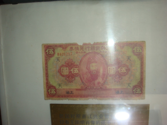 阳明故居中,看到一张民国时期发行的纸币,上面印着王阳明的肖像(不知是否与蒋介石的推重有关)——