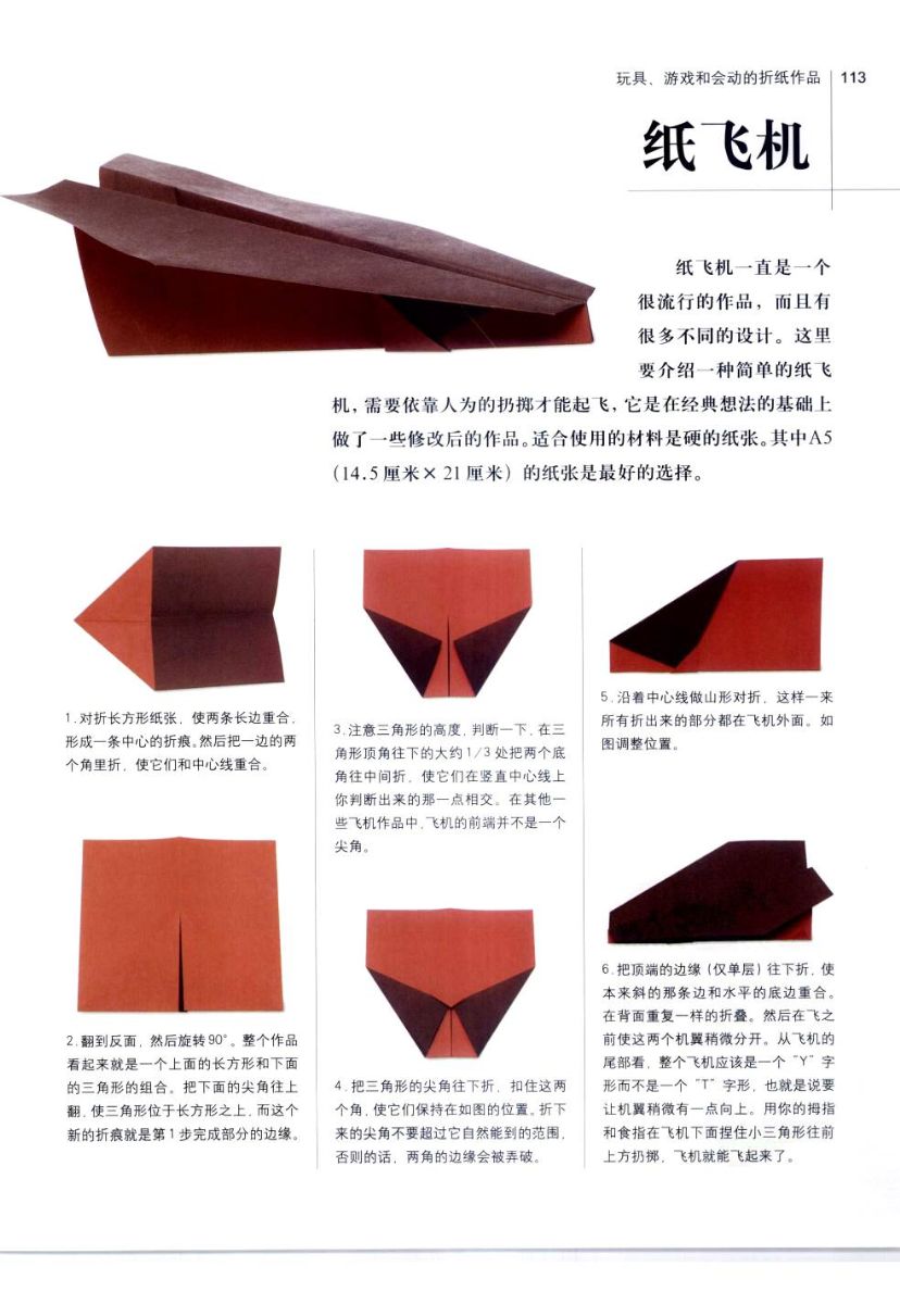 这种纸飞机仅需6个步骤来制作。可以使用一张长方形的纸,如A4纸:21cm×29.7cm ,四开纸:正度389mm×546mm 大度 444mm×597mm等,来制作这种纸飞机。