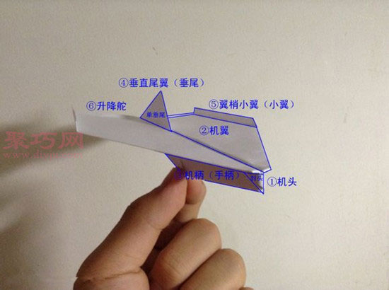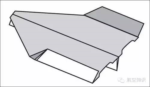 ⑥升降舵,是纸飞机的一个重要构成部分,纸飞机的设计内容几乎不包含这个构造,但这个构造却不可少,主要用于增大升力,大小没有准确值,视具体情况而定,当升力不够,机头坠地,升降舵向上捻;当升力太大,抛不高时,升降舵向下捻,减小不必要的升力,角度一般在30°-45°之间;
